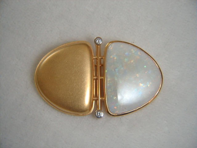 Brosche in 750/‰ Gelbgold mit einem Opal und zwei Brillanten.