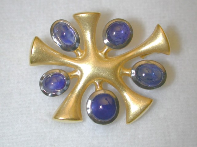 Brosche in 750/‰ Gelbgold mit Saphir Cabochons.