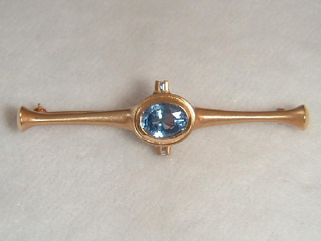 Brosche in 750/‰ Gelbgold mit einem facettierten Saphir und zwei Diamant Baguettes.