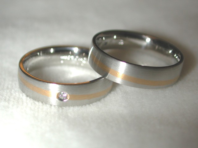Eheringe in 950/‰ Platin mit Feingoldlinie und Brillant.