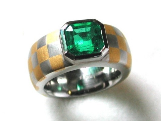 Ring in 950/‰ Platin und Feingold mit einem facettierten Smaragd.